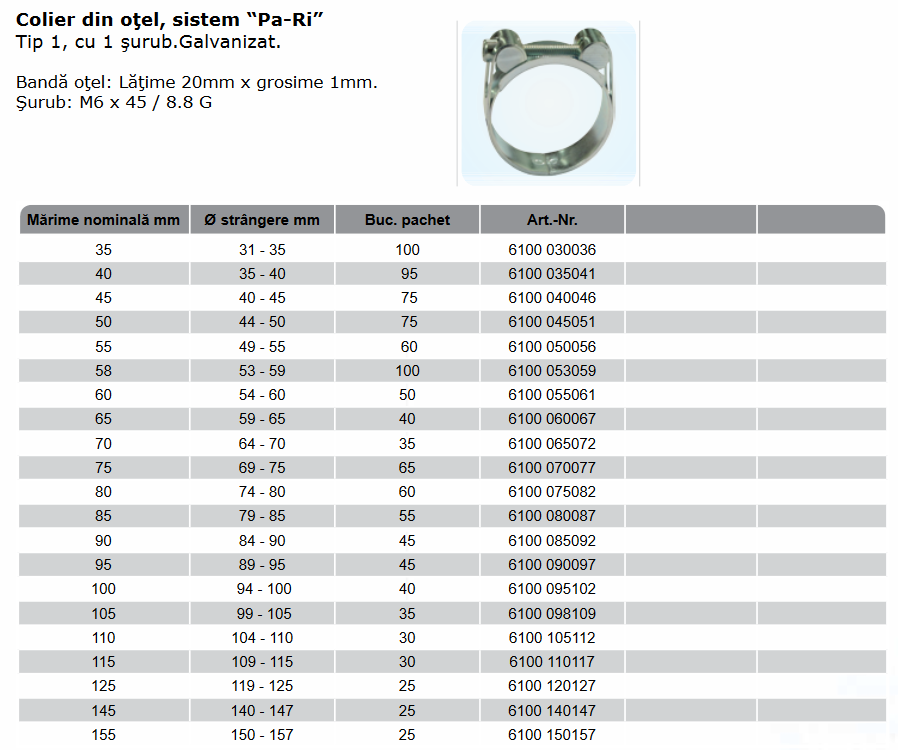 Colier sistem “Pa-Ri” Tip 1, cu 1 şurub