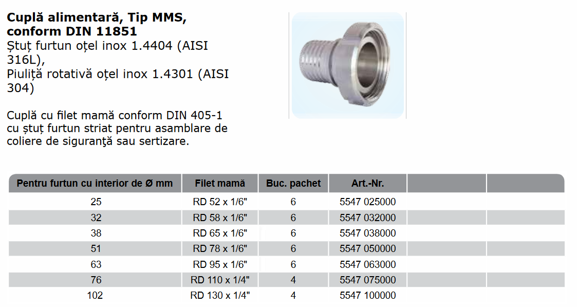 Cuplă cu filet mamă si ștuț striat, Tip MMS