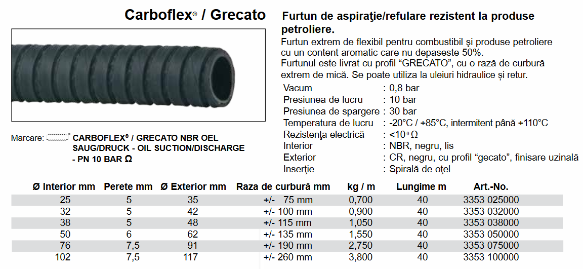Furtun cauciuc aspiraţie/refulare produse petroliere, 10 Bar