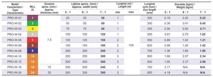 Factorul de siguranţă este 7:1; la cerere se pot furniza chingi cu factor de siguranţă 5:1 sau 6:1. Chingile tip PRO-W dețin certificat de producție TÜV Rheinland.