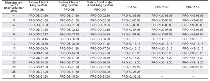 Tabel centralizator în care regăsiți marea majoritate a accesoriilor grad 80 precum și corespondența acestora cu diametrul de lanț la care se pot folosi.