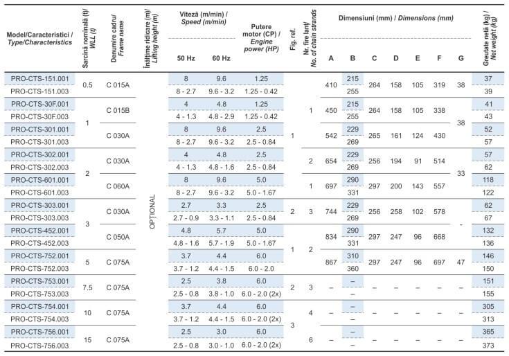 Terminația 001 din codul modelului reprezintă palanul cu simplă viteză, iar terminația 003 reprezintă palanul cu dublă viteză.