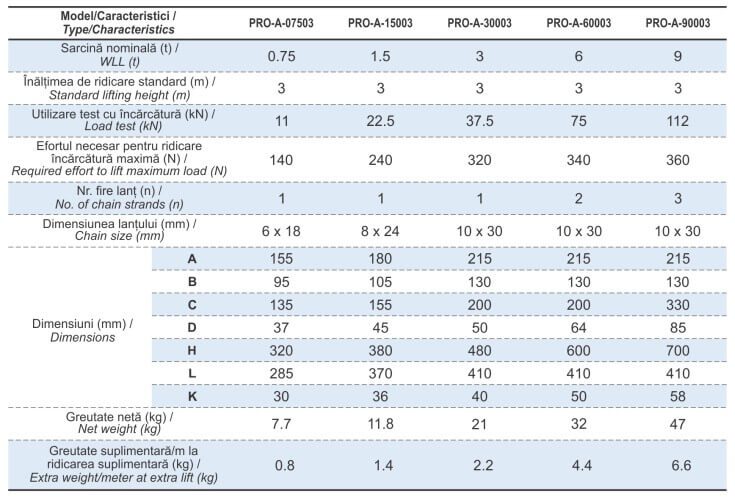 La cerere, palanele pot fi livrate cu protecţie la suprasarcină și echipate cu lanț la lungimea solicitată de client.